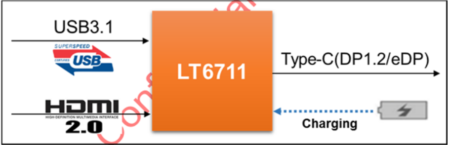 The Lontium LT6711 is HDMI2.0 to DP1.2 converter with internal Type-C Alternate Mode switch and PD controller.
