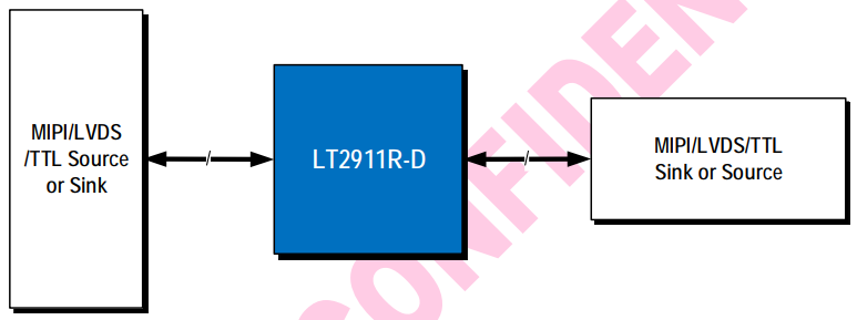 The Lontium LT2911R-D is a high performance convertor which interconvertible between MIPI DSI/CSI-2/Dual-Port LVDS and TTL. The LT2911R-D deserializes input MIPI/LVDS/TTL video data, decodes packets, rotates video, changes frame rate and converts the formatted video data stream to MIPI/LVDS/TTL transmitter output between AP and mobile display panel or camera.