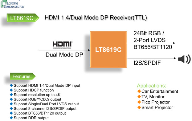 The Lontium’s LT8619C is a high performance HDMI/Dual-mode DP receiver chip based on ClearEdge? Technology, compliant with the HDMI 1.4 specification. The TTL output can support RGB, BT656, BT1120 and the output resolution can support up to 4Kx2K@30Hz resolution.