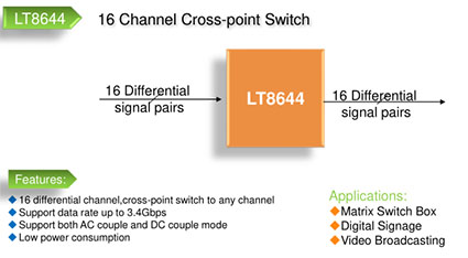 The LT8644 is a 16×16 digital crosspoint switch, with 16 differential CML compatible inputs and 16 differential CML outputs. The LT8644 is optimized for nonreturn-to-zero (NRZ) signaling with data rates of up to 3.4 Gbps per port. Each port offers programmable level of input equalization and programmable output swing. The LT8644 supports independent channel switching through the serial control interface. The LT8644 has low latency and very low channel-to-channel skew. An I2C interface is used to control the device and provide access to advanced features.
