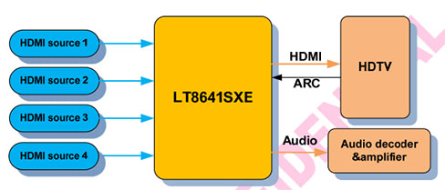 The LT8641SXE is a Transition Minimized Differential Signaling (TMDS) switch that enables the connection of multiple High-Definition Multimedia Interface (HDMI) source devices to high-definition television (HDTV). Based on the HDMI 1.4 specification, LT8641SXE is an advanced TMDS switch that delivers a cost-effective method for manufacturers to add additional HDMI ports to their HDTV. Multiple HDMI ports allow consumers to connect variety HDMI-enabled sources to their HDTV. It supports HDCP 1.4 specifications, and Audio Return Channel function.The LT8641SXE is a four-to-one (4:1) switch ideally suited for use in the back panel of HDTV and A/V receivers, allowing consumers to connect multiple HDMI-enabled devices such as high-definition DVD players, set top boxes and game consoles. The LT8641SXE switch selects a single HDMI or Digital Visual Interface (DVI) signal from the four receiver ports and generates HDMI/DVI audio/video output, as well as DDC/HPD switching, in full compliance with the HDMI and DVI specifications. The LT8641SXE also acts as a HDMI receiver. It extracts the digital audio information from the HDMI packet, and recovers digital audio to I2S/SPDIF interface. So it can be applied to the multi-channel audio amplifier for best audio effect. This feature can enable an external HDMI switching box acts as a home entertainment box that can output up to 8-channel high quality audio signal for the best audio effect.