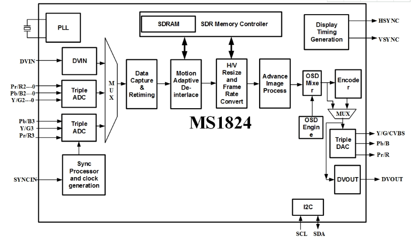 TV decoder, TV encoder module and a triple DAC module with OSD function. It can accept interlaced or