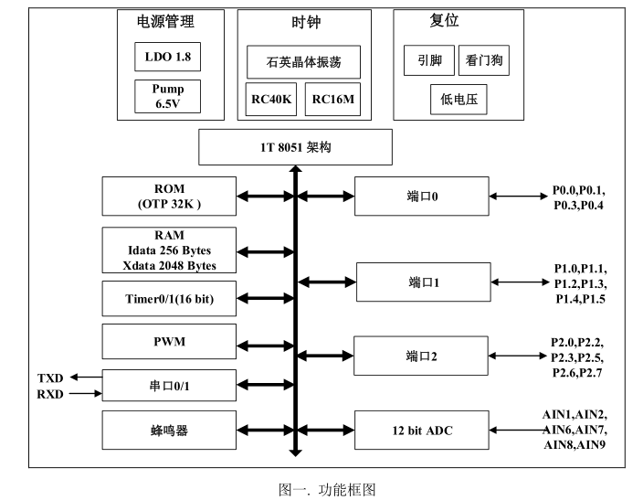 和 2 個 16 位定時器;芯片還集成了 2K 字節外部擴展 RAM 和 32K OTP ROM,并且可實現在