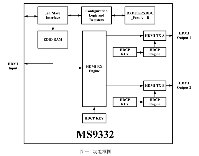 線傳輸。MS9332 集成內部 EDID RAM 和 HDCP KEY RAM。