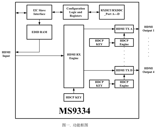 線傳輸。MS9334 集成內(nèi)部 EDID RAM 和 HDCP KEY。