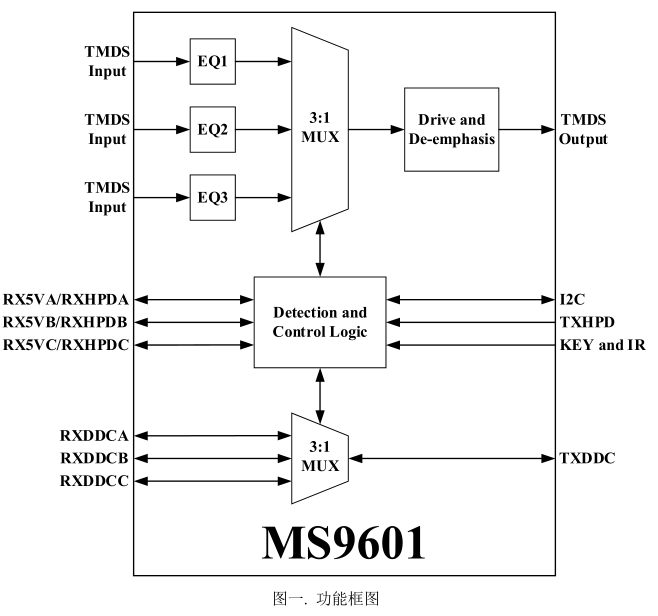 MS9601提供3路HDMI輸入端口和1路HDMI輸出端口。芯片從3路輸入信號中選擇1路,產
