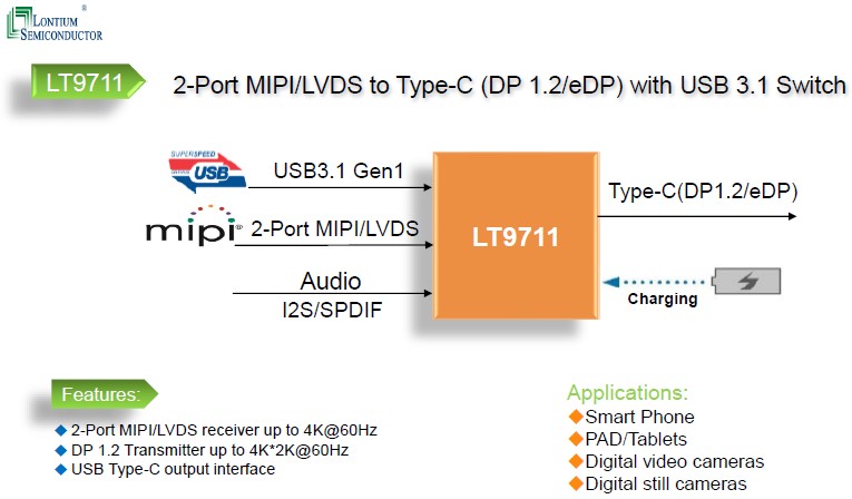 Lontium LT9711是雙端口MIPI/LVDS到DP1.2轉(zhuǎn)換器,內(nèi)部c型交替模式開關(guān)和PD控制器。