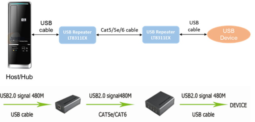 LT8311EX is a low cost high performance USB repeater that supports signal transferring extension over cat5/5e/6 cable, compliant with USB2.0 specification. The extension length can be up to 120 meters over CAT6 cable. It eliminates the 5 meters distance limitation of USB2.0 specification. There are four lines used for signal transferring extension between two LT8311EX chips. Internal equalization settings can be changed through I2C interface for different extension lengths.